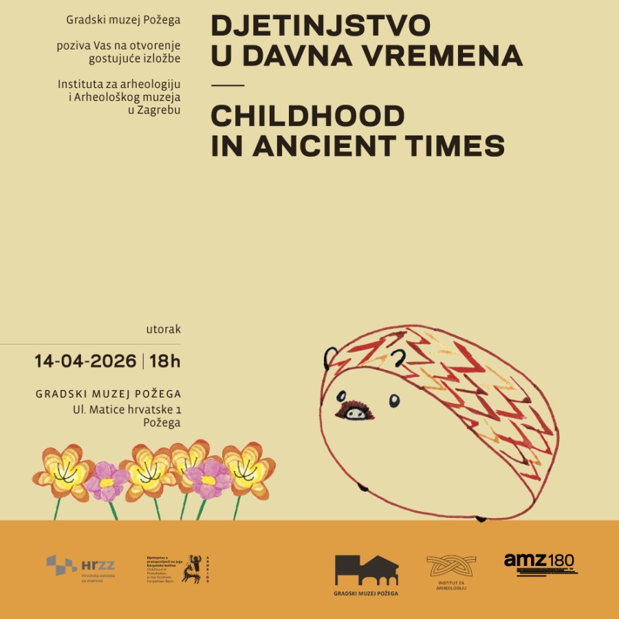Gostujuća izložba Instituta za arheologiju i Arheološkog muzeja u Zagrebu u Gradskom muzeju Požega otvara se 14. travnja 2026. godine u 18:00 sati. O djetinjstvu u davnim vremenima zna se malo. Način života djece, interakcija između djece, okoliša i svijeta odraslih, izazov su u istraživanju prošlosti djetinjstva. Arheologija djetinjstva nudi brojne mogućnosti proučavajući arheološke kontekste i materijalne ostatke u kojima su zabilježeni tragovi djece i dječjih aktivnosti sa svrhom što potpunijih odgovora na pitanja o zdravlju i prehrani djece, društvenom statusu prema dobi i rodbinskim vezama, njihovoj svakodnevnici, odnosu prema zavičaju u kojem su živjela te životinjama koje su poznavali.